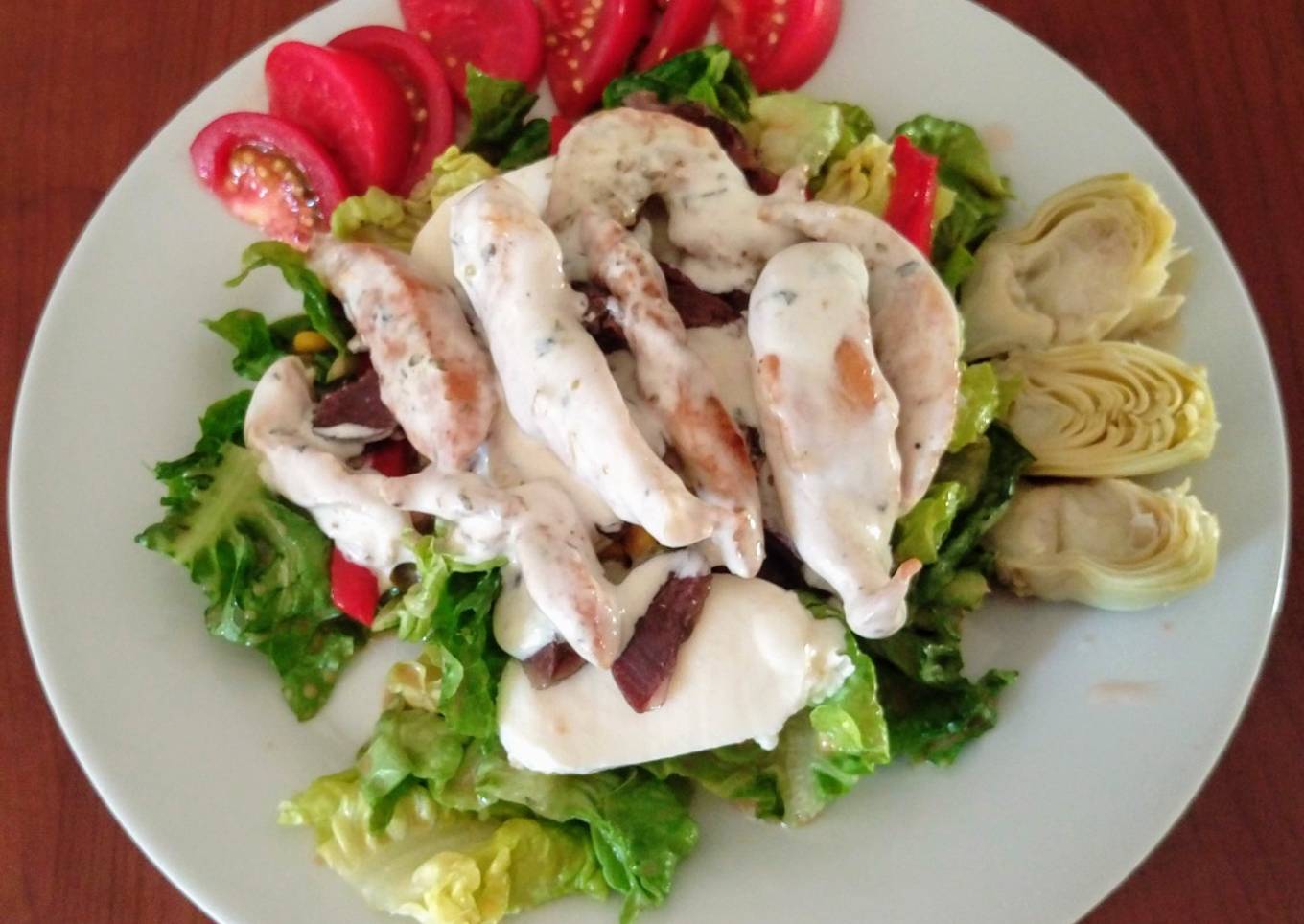 - En cada plato echamos un poco de ensalada, un puñado de maíz, tiras de pimientos, varias rodajas de queso de cabra, varios cascos de tomate, las mollejas de pato, las alcachofas y por último las tiras de pollo con roquefort.