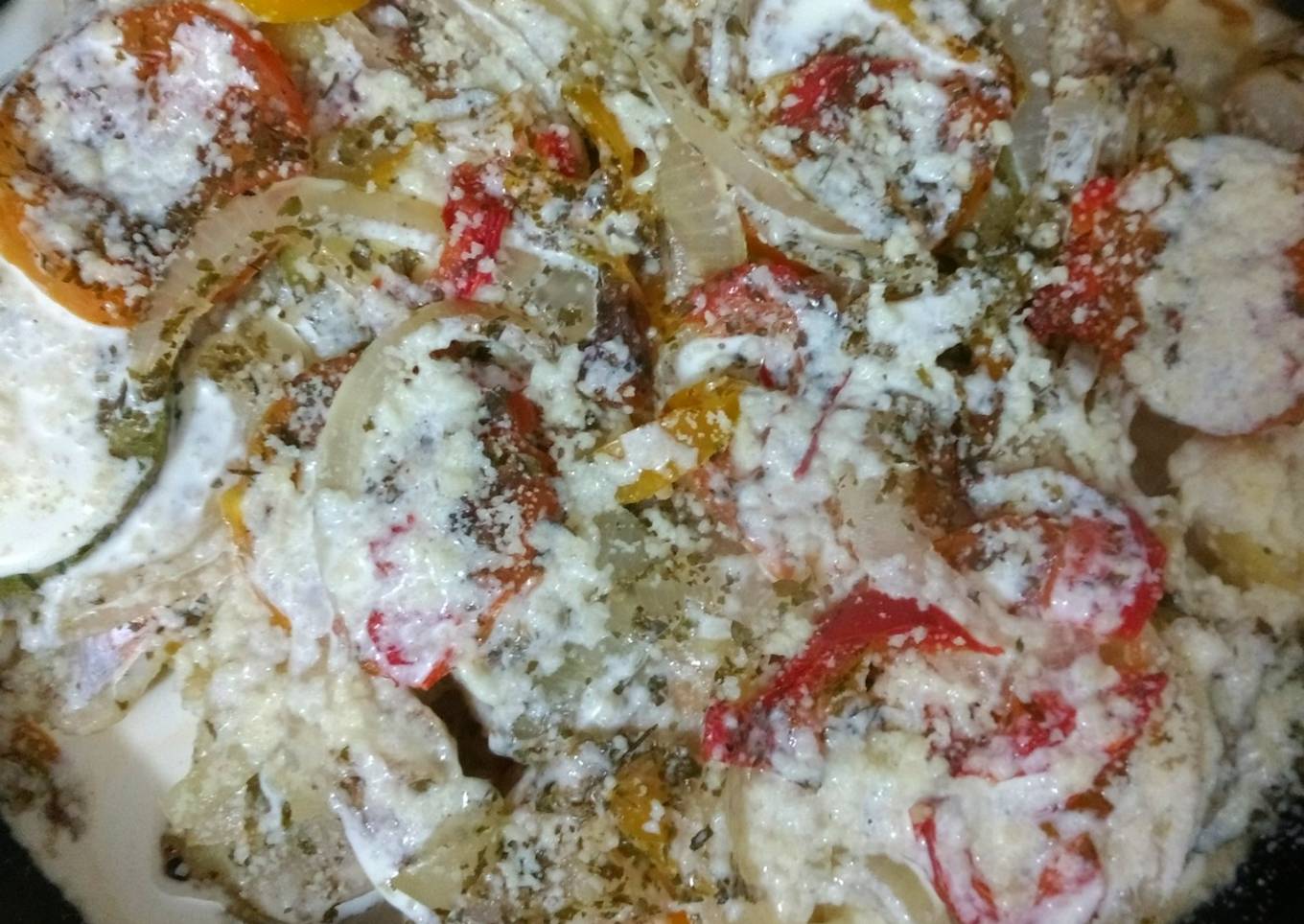 - En una fuente, en mi caso una sartén con tapa acomodé unas rebanadas de papas zucchini, y la mitad de la cebolla, espolvoreadas con provenzal, y sal entrefina. Acomodé los filetes a los que les coloqué un poco de pimienta y unté con un poco de ketchup, un poco de sal, y cubrí con lo que quedó de verduras, sal y Provenzal