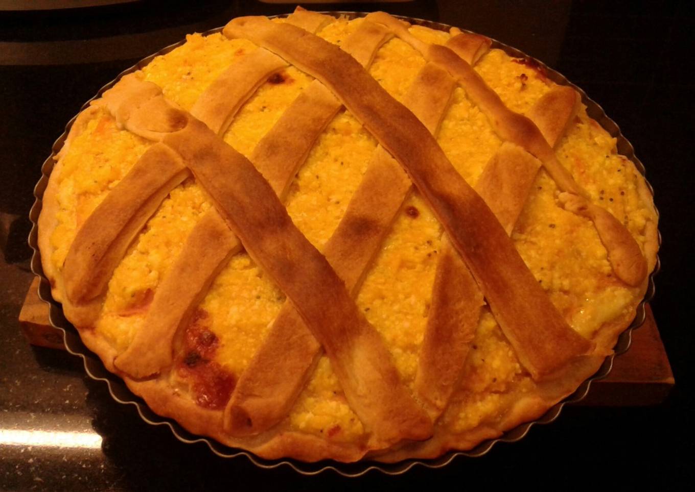 Torta saludable que invente para que el zapallo ya estuviera incluido en ella y al incorporarle jamón y queso y las tiritas de masa que la asemejan a una torta de fiambre .... la hace más apetitosa y atractiva a la vista😄.
