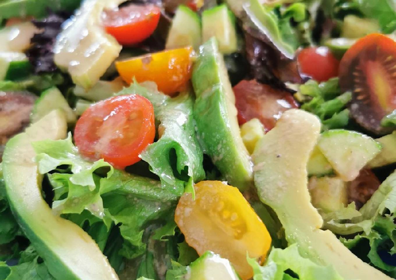 - Rebanar los pepinos y el aguacate. Cortar los tomatitos en mitades. Acomodar todo sobre las lechugas.