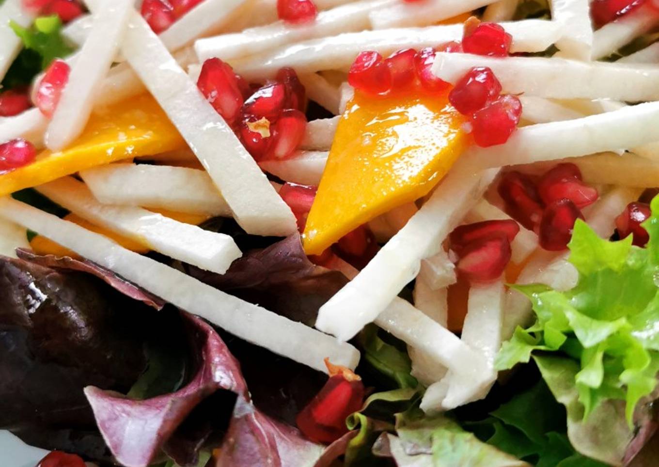 Steps to make to make Ensalada de lechuga y jícama con mango y granada