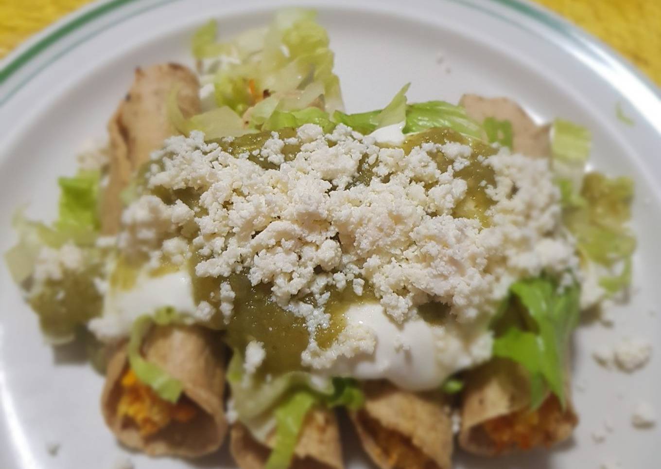 - Formar los tacos, el relleno es suficiente para que queden bastante llenitos. Fijarlos con un palillo, yo ensarto de tres en tres. Freír en aceite muy caliente. También pueden hacerse en freidora de aire, solo hay que darles una ligera rociada con aceite en spray y hornearlos por 10 minutos a 200°C (400°F). Servir acompañados de lechuga rebanada fino, crema, queso y la salsa de tu preferencia. ¡Deliciosos!