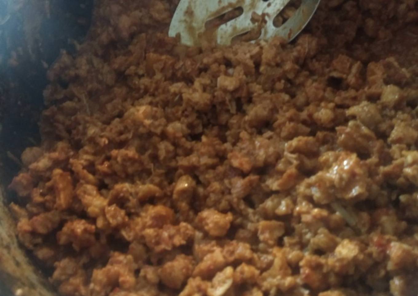 - Pon el aceite a calentar y sofríe la soya hidratada y súper exprimida, ya que se seca y sofríe integra el adobo de la licuadora