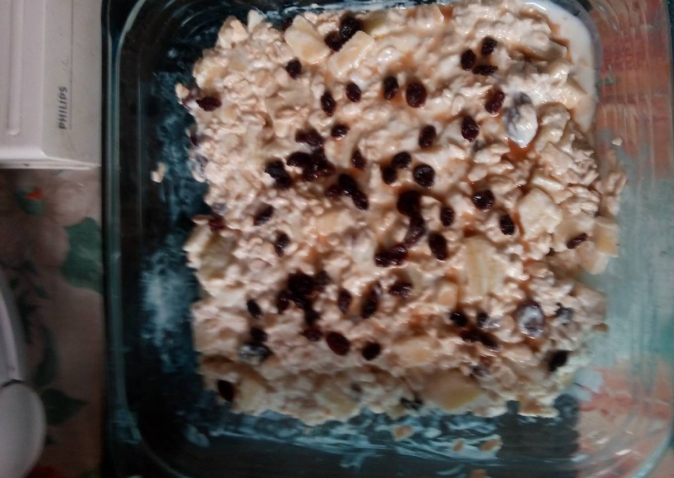 - Después verter en un toper para poder revolver junto con: Pasitas, yogurt, avena, la canela y vainilla. Posteriormente revolver todo de arriba para abajo...