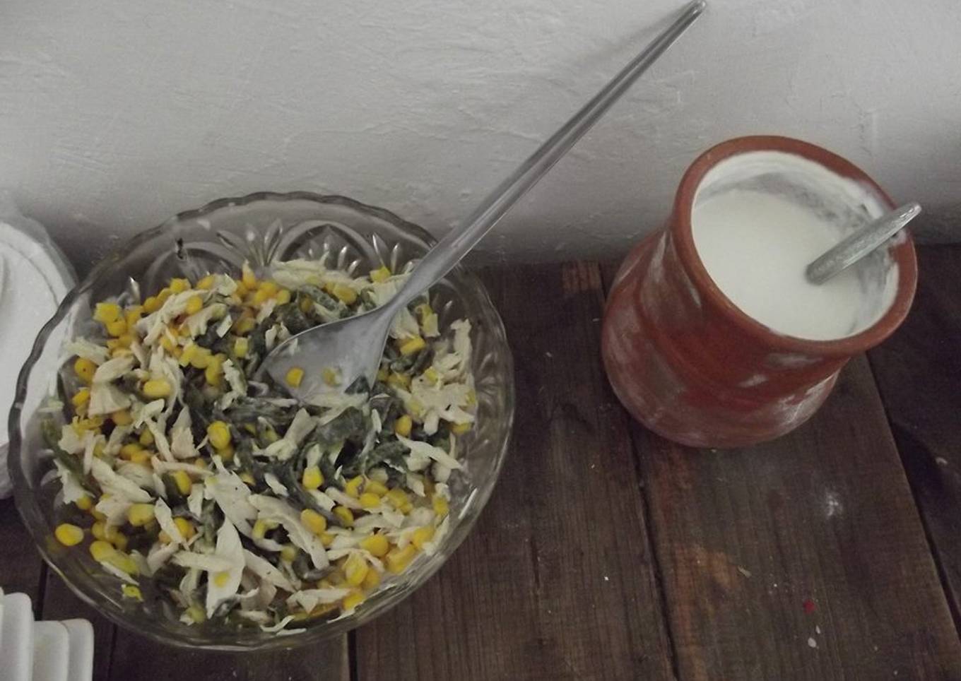 Hey everyone, hope you're having an amazing day today. Today, we're going to make a distinctive dish, Ensalada mexicana de pollo, poblano, elote, cebolla y jocoque las correa. One of my favorites food recipes. For mine, I am going to make it a bit tasty. This is gonna smell and look delicious.